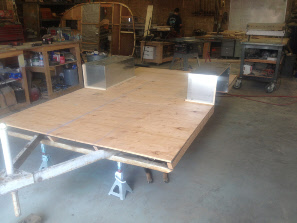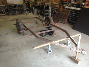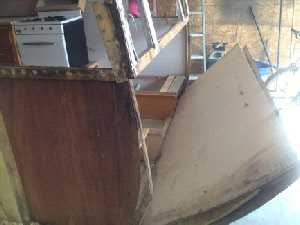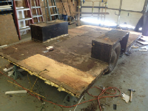 The teardown begins... Wow, we soon discovered the wallpaper was actually some sort of fabric covered paneling that had been overlaid over the entire interior of the trailer. I have to admit they did a nice job, but somebody did a lot of work to not really repair anything... the structural damage of the rotted wood remained. As we pulled the aluminum skin, the trailer simply started falling apart. Even the floor decking was completely rotted, by the time we got rid of all the rotted wood all we had left was the steel chassis. We soon had all new floor framing and decking, including new wheel tubs.