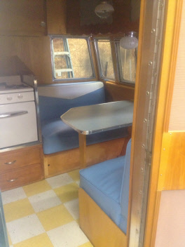 Here is a good example when we work with a client long distance on the design. We work closely via email, photos and phone calls to come up with a design. In this case we decided on a yellow and white checkerboard floor, 1956 Chevy Nassua Blue and white paint, NOS blue boomerang Formica laminate and matching shades of blue and white vinyl upholstery to end up with a pleasing combination.