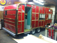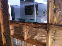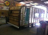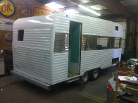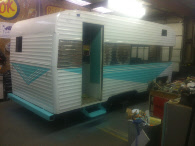 Better than most we get in it did have the typical water damaged areas. This one will be a piece of cake to repair, two days at the most. We did do a judgement call. The large rounded corners were stained but by poking and probing at them we determined they were still good solid wood, so we chose not replace them. Insulation, some wiring upgrades and it was ready for new skin. We added a band of polished for flash, and then painted a factory Terry three stripe design in a 1956 Studebaker color. Many fifties cars have colors that look period correct on vintage campers.