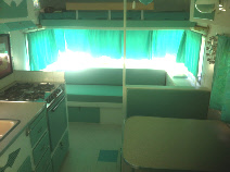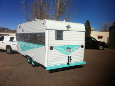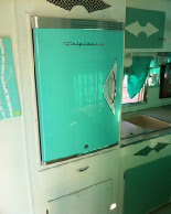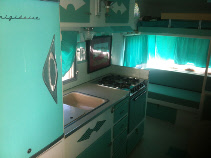 The owner had already decorated the interior in a very attractive turquoise and white. Other than a new floor we laid, all other interior work was pretty much hidden from view. We upgraded the water system with a new 10 gal hot water heater, added one of our retro fridges, this one out larger 4.5 cu ft version, added a rooftop ac and removed a defective heater allowing us to add a new cabinet and drawer for extra storage. Three weeks later and details like new baby moon caps, matching propane tanks and the correct reproduction decals it is back home with it's happy owner.