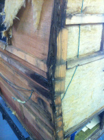 The water leaks had already began to damage the wood framing and the insulation was starting to mold. Fortunately, with the skin off we were able to properly repair the wood framing without disturbing the interior paneling as shown in the example to the left. At the right, new insulation and a couple of wiring upgrades it is ready for new skin.