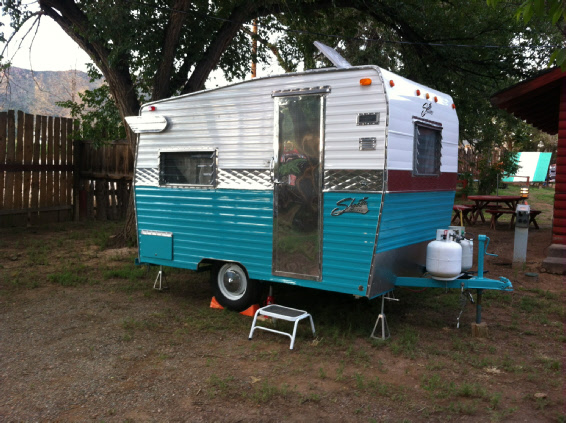 What a difference a little paint and polish can do! New white with our standard tropical turquoise really changed the look of this little Shasta. We replaced the dull gold anodized trim panels with some new polished diamond quilted aluminum. Now it really has some style!