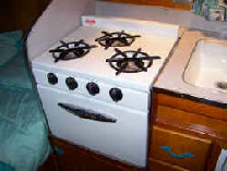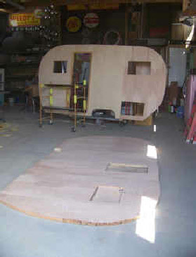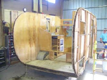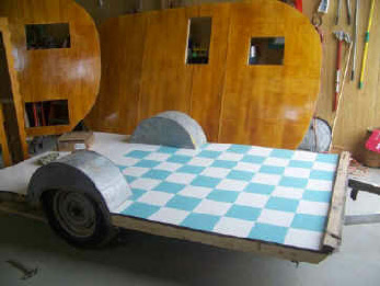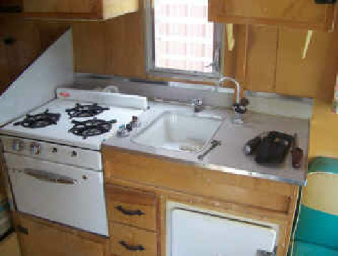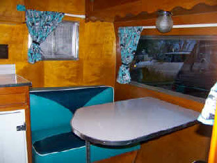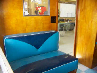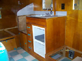 While a lot of the interior paneling was solid, due to all the scratches and other scars we decided building a whole new cabin was the way to go, so we tore it all the way down to the flatbed. New walls were built, the cabinets refinished and we laid down a new turquoise & white checkerboard floor. While it’s all apart is the best time to lay the floor, that way it’s continuous all the way under the cabinets. For fun Sylvia designed the color scheme on this one... She did the seats in a turquoise vinyl with blue Zodiac accents matching the curved dip on the outside. They looked great. We restored the stove & ice box, the ice box had extra insulation added before it was reinstalled. All new wiring, plumbing, etc, etc.