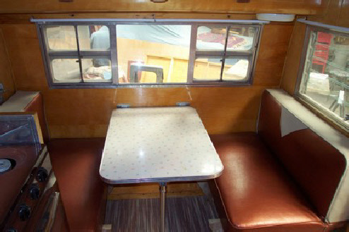 The finished trailer! We matched the original colors and scheme on the outside. We only had to do some fresh shellac on the interior wood to match the new panels, the rest of the interior was amazing for its age. That is the factory original seat covers, table/counter tops and the floor was almost perfect! The owner had really taken care of it over the years.