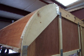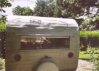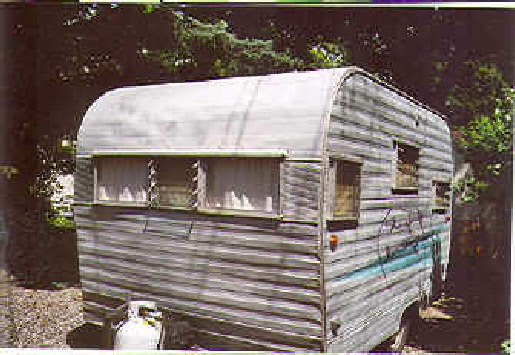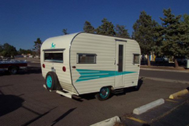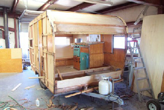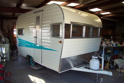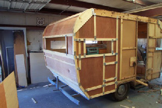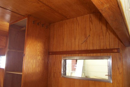Above left you can see how we matched the original oak finish, the closet is the original. Above right we are almost finished... We added the “Roadrunner” arrow on the side, polished diamond quilted trim by the front window like it had from the factory. We did add an optional rock guard to the front. This pebble grained aluminum will not show dents and dings from rocks thrown up by the tow vehicle.