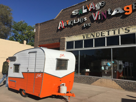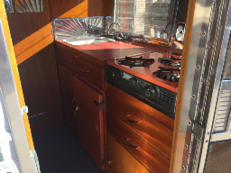 The interior featured new old stock coral boomerang laminate, an orange stovetop and icebox salvaged from another camper, new polished backsplashes, and a custom wrap around seating, not the normal Shasta layout. The big table does lay down to make a king size bed in such a small space. The outside was painted Omaha Orange to match the theme.