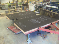 Shasta Compacts are not know for sturdy floors. They have only one long board down the center of the chassis and short ones along the outside edge along the frames outriggers, covered only by a thin plywood base. After we cut off and welded in a new rear crossmember to the chassis to replace the wrecked one, we added a bit more framing structure. We put down a layer of Celtex, to add some insulation under the trailer, then new OSB underlayment. Final step was new flooring, this time a neutral gray/blue, the owners choice.