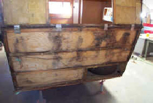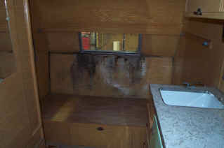 This was a fairly decent camper before we started. It did have some serious water damage under the front and back windows, the skin has quite a bit a hail damage and a couple of big rips in the skin. However it was complete with good countertops, flooring and great sea foam green appliances.