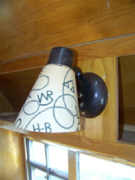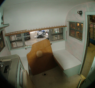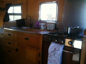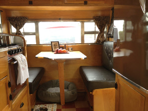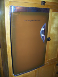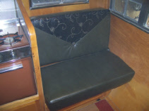 With her design skills the trailer turned out absolutely beautiful. The cabinets were built out of a combo of birch and hemlock, then fitted with flush mount floating panel doors with some great antique looking hardware the owner supplied. She also located the light fixtures which really added a vintage touch once I refinished the metal parts to match the antique hardware. We added one of our custom built refrigerators, this one done in coppertone to match the restored stove. The seats were covered in leatherette, a great choice of materials. Leatherette is a processed material made from real leather but is not limited to hide sizes, a real cost effective way of getting the feel and aroma of durable leather.