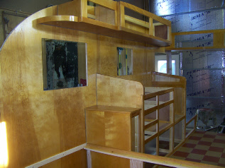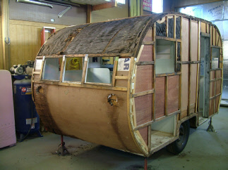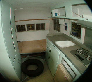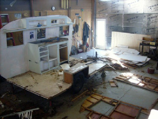 Apart it comes. The patch jobs done were horrendous, one side was actually a piece of corrugated cardboard glued to rotten paneling and covered with the drywall compound. The ceiling panels had insulation glued up to the tin, and then paneling glued up to the insulation to hold it up. It was so bad it was to present a challenge, as it fell apart so bad during disassembly that I wouldn’t even have good patterns. Remember the solid floor? A first for me, a 1/2” layer of concrete (yes, concrete!) had been poured over the rotted floor and then had cheap vinyl flooring glued to it. Once it was all said and done all I had left was a bare frame.