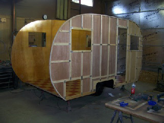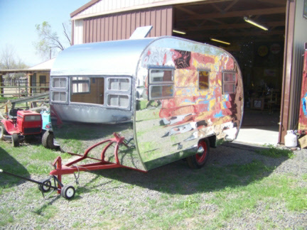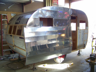 This one ended up being a complete frame up restoration, we saved the chassis, the windows and the sink. Everything else was completely new. The owner is a custom kitchen designer by trade so she designed her own cabinetry, sent me blueprints and I built them to her design. On the exterior we used our polished aluminum matching the original factory patterns.